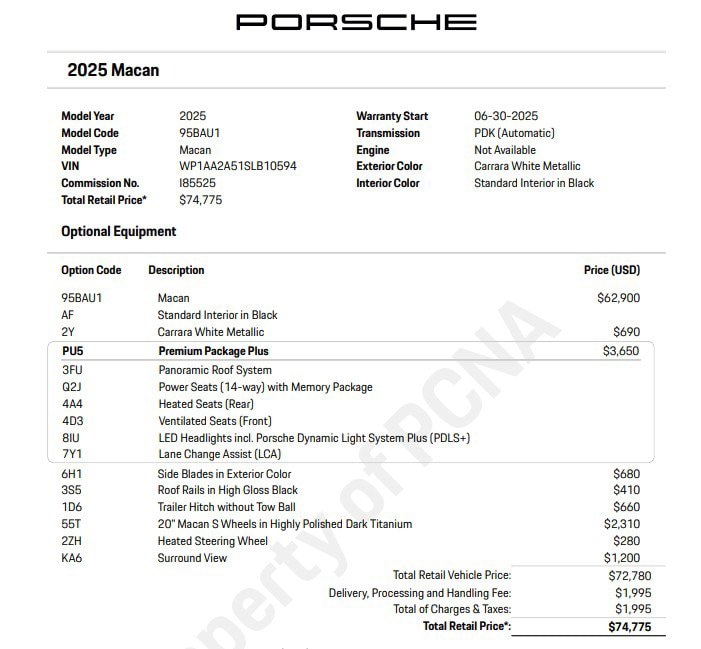 Pricing excludes tax, tag, title and pre-delivery service fee of $999 and private tag agency fee of $24.40. *See below for details..Suncoast Porsche Courtesy Vehicle with Only 5,347 Miles..Porsche Certified!..Wow this All Wheel Drive Macan includes Premium Package Plus with a Panoramic Roof System..Adaptive Cruise Control..Lane Departure Warning..Heated Seats (Rear)..Surround View Camera..Lane Change Assist..10.9" Touchscreen..12.6" Curved Digital Instrument Cluster..Heated/Ventilated, Power Leather Seats (14-way) with Memory Package..LED Headlights including Porsche Dynamic Light System Plus..20" Alloy Wheels..Heated Steering Wheel..Power Tailgate..Power Steering Plus..2.0 Liter, 261 HP Turbocharged Inline-4 Cylinder..7-Speed Porsche Doppelkupplung (PDK) Automatic Transmission..Navigation Module for Porsche Communication Management..Apple CarPlay..USB Ports..Voice Control..Smartphone Compartment with Wireless Charging..Satellite Radio..Front/Rear Park Assist..Heated Steering Wheel..Comfort Access..HomeLink..Bluetooth..3-Zone Climate Control..Comfort Lighting Package..Tow Hitch..Warn and Brake Assist and much more..All pre-owned cars regardless of make and model are driven and evaluated by our highly qualified service personnel. Call Our Sales Team Now at 941-923-1700 for More Info, a Test Drive Appointment or to have a Custom Video Sent to you on this Vehicle. Fast Out Of State Shipping Available..The secret of why our cars hold their values: passion never ages. Owning a Porsche should be a very special experience. That's why, when you buy a Porsche Approved Certified Pre-Owned vehicle, we do everything we can to ensure it's really as good as it looks. Porsche Approved Certified Pre-Owned Details:Roadside Assistance. 2 year/Unlimited miles beginning after new car warranty expires or from certified purchase date. Includes Trip Interruption reimbursement. 111 Point Inspection. Transferable Warranty. Warranty Deductible: $0. See dealer for details..What the reviews say..Tasteful exterior styling, willing turbo-four, brilliant chassis tuning. A Porsche first and an SUV second, the Macan delivers a joyful sports sedan driving experience in a compact-SUV package. The Porsche Macan wasted little time establishing itself as the performance benchmark of the compact luxury SUV segment when it debuted a decade ago. Though the Audi Q5 and BMW X3 and their respective sporting variants beat it to market, the Macan's balance of performance and driver involvement set a new standard. The chassis does its part, serving up confidence-inspiring handling, braking, and direct steering worthy of the Porsche name. By blending sports-sedan driving dynamics with a dose of SUV practicality, the Macan earned its spot on our 10Best Trucks list for 2025. As one of our favorites in its segment, it also earned a spot on our Editors' Choice list for 2025. At our test track, the base turbo four-cylinder Macan bounds to 60 mph in just 5.0 seconds. The 2025 Porsche Macan is the best luxury SUV you can buy when it comes to performance. Its nimble handling and overall vibe feel more sports car than luxury SUV. How does the Macan drive? The Macan feels every bit a Porsche on a twisty road. The way it stops, steers and handles gives you complete confidence, and it's a joy to drive along uncrowded backroads. Driving the Porsche Macan is a highly enjoyable experience. Rather than feeling bulky like some SUVs, the Macan handles more like a sports car. Its precise steering and excellent brakes are also nice perks in this segment. The Macan's compact size makes it easy to maneuver in tight spots. All-wheel drive is standard in all trims. The 261-horsepower turbocharged four-cylinder engine helps the Macan accelerate quickly and gives it plenty of passing power on the highway.